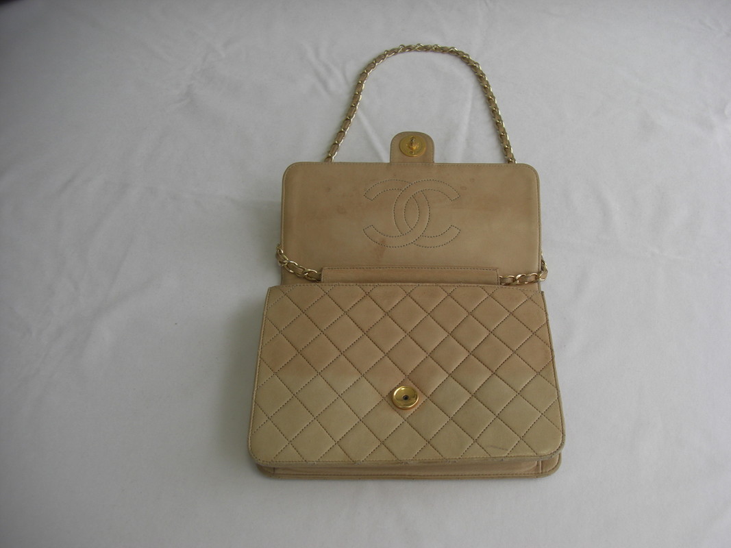 シャネルマトラッセの色あせやカビはクリーニング、色補正にてメンテナンス致します。内側のポケット内合皮素材の劣化によるべたつきも内袋交換にてメンテナンス承ります。