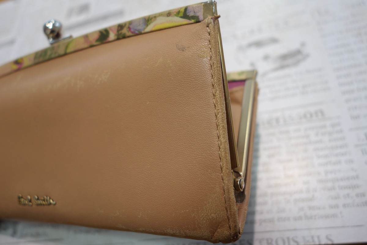 ポールスミス財布のパイピング補修のご紹介です。染色補正で目立たなくする事は可能でも残ってしまう折山縁の破れにパイピングを施し隠してしまうケア方法です。