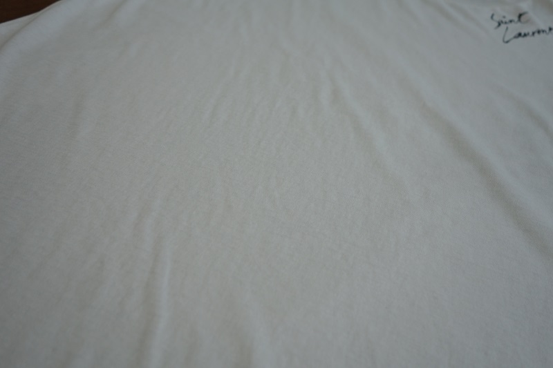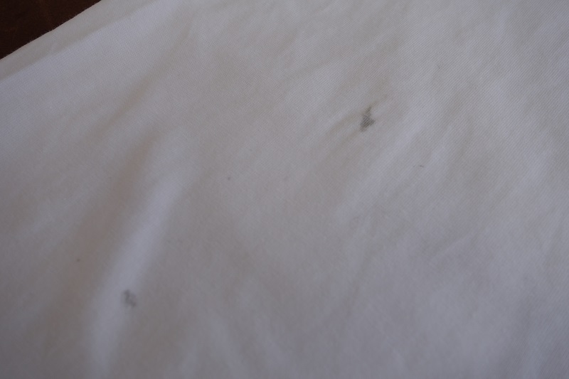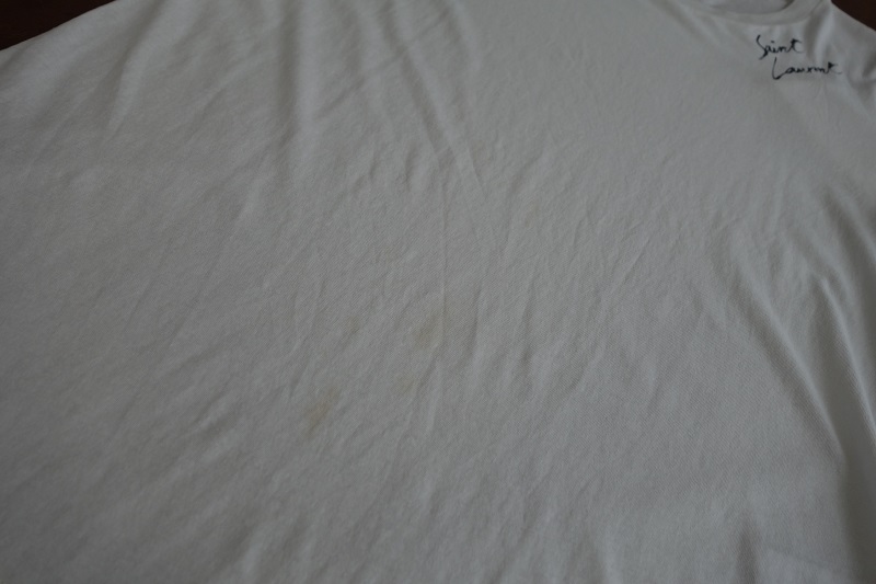 白いTシャツについたシミは状態に合わせてクリーニング後、染み抜きする事で除去いたします。黄ばみが出ている場合はシーズンに一度程度ホワイトニング(漂白加工)することでスッキリと着用することができます。
