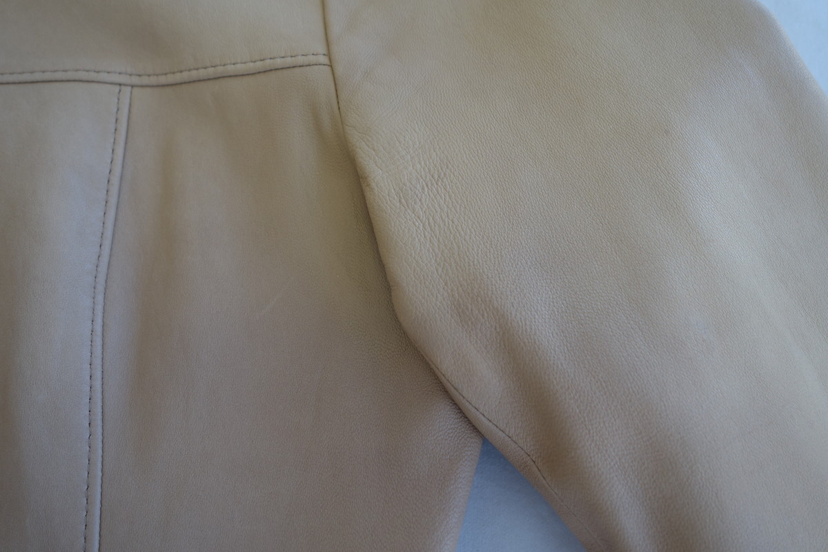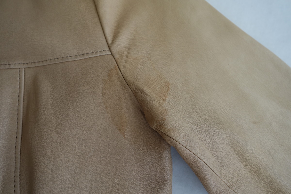 レザージャケットについたシミはクレンジング後、染色補正を施しシミを隠します。革質や染め方などによってケア内容が異なります。アイテムによって最善の方法をご提案いたします。