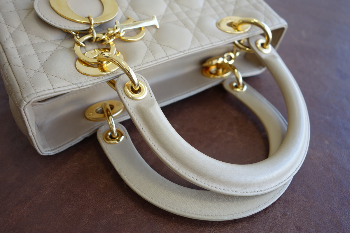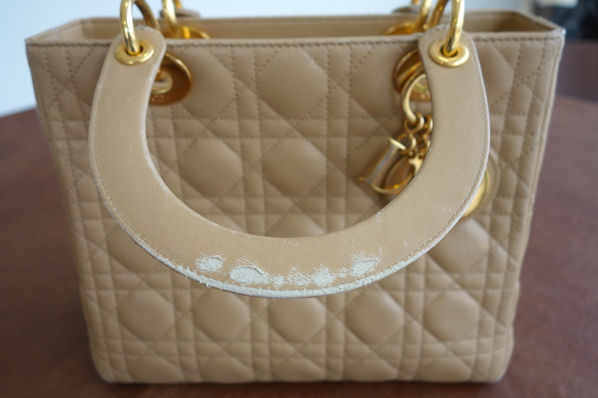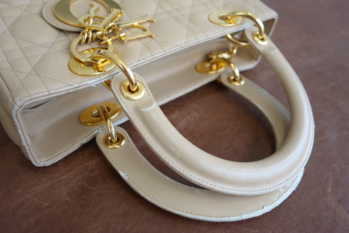 レザーのディオールバッグのハンドルの傷なども染色補正を行い目立たなく致します。傷が大きい場合などは交換や作成も可能です。