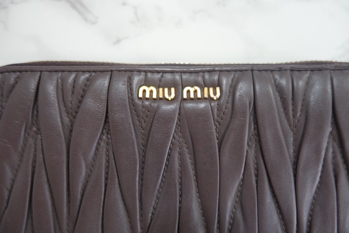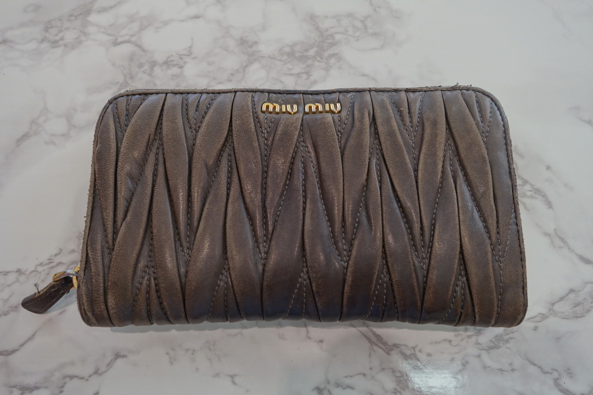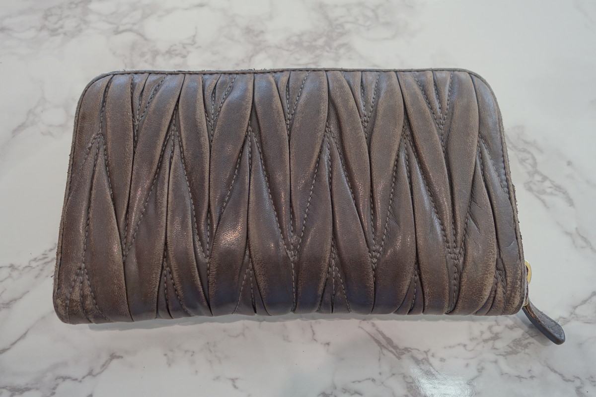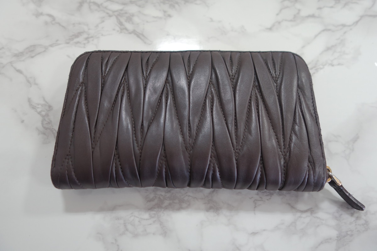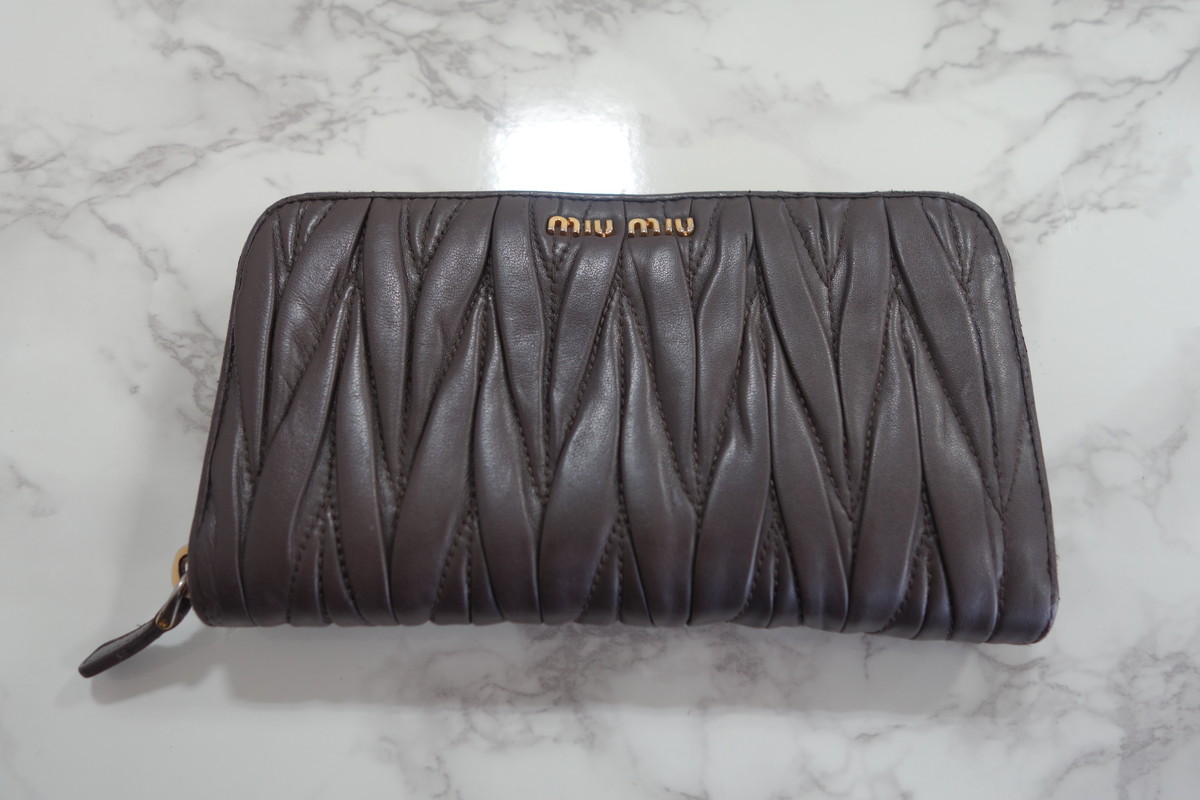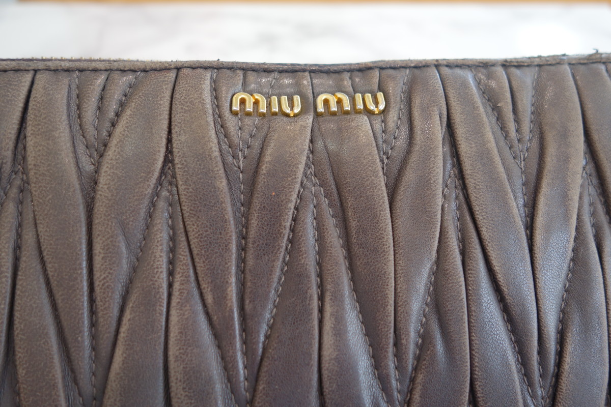 プリーツの入ったデザインが特徴のミュウミュウのマテラッセラインのお財布やバッグのクリーニングや色補正も対応可能です。