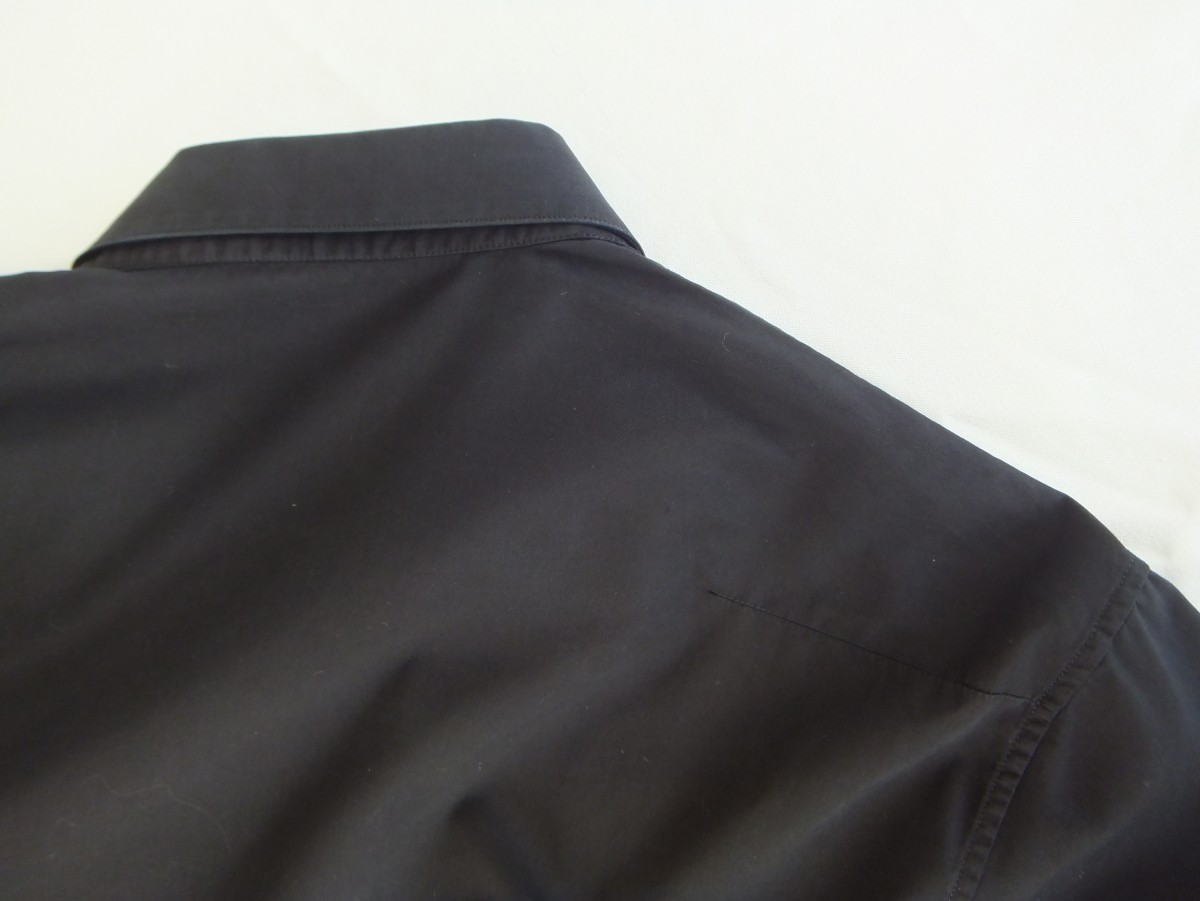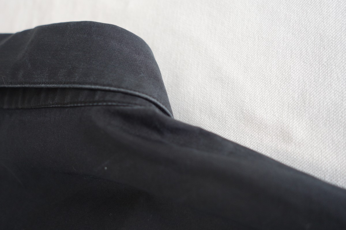 襟元や袖口に退色が見られます。襟元や袖口は肌に触れる事が多く、汗や皮脂汚れ・袖口に関しては物に触れる事でスレて退色しやすい部位となります。