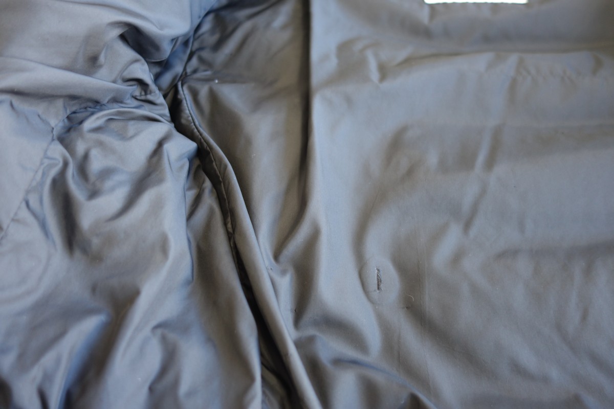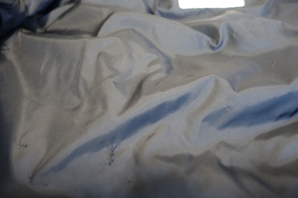 また、身頃裏地に生地のスレ破れを確認しましたので一緒に接着補修を行わせて頂きました。補修跡が目立ちますが補修範囲は最小限に仕上げさせて頂きます。