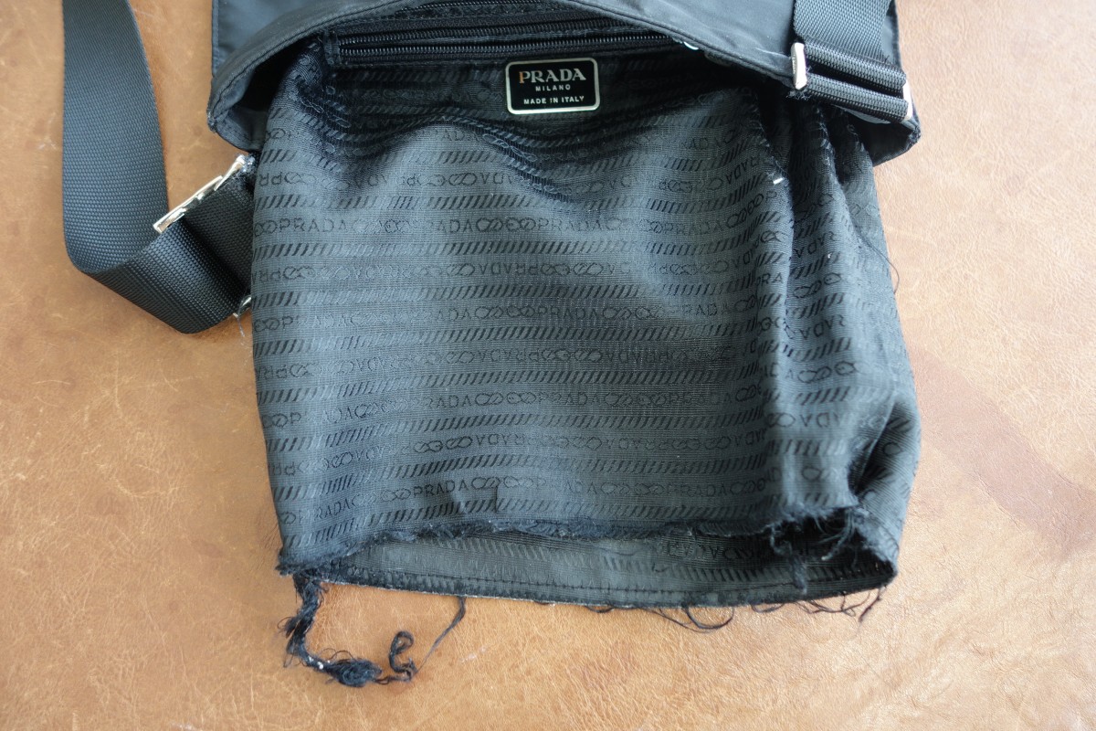プラダの内袋は、折りが繊細な為ほつれやすい素材です。