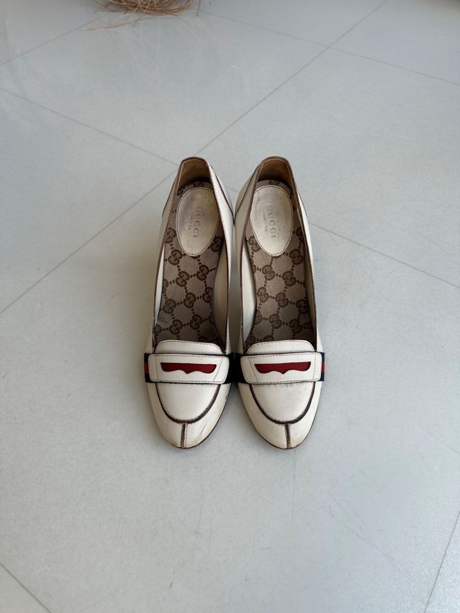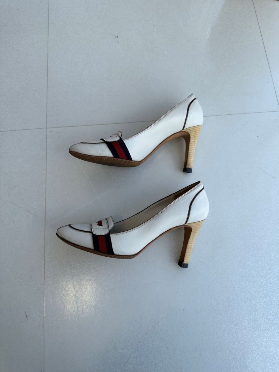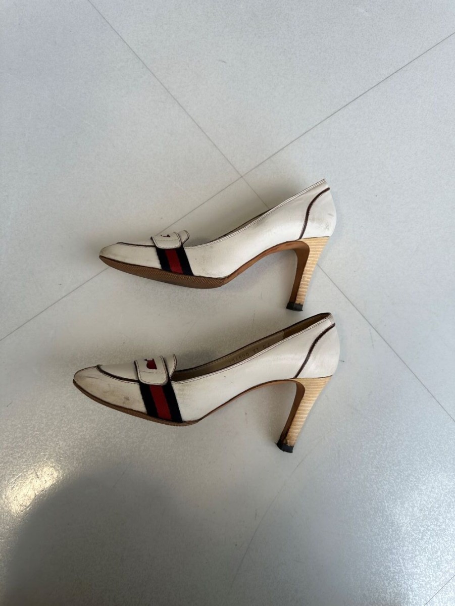 GUCCIのパンプスクリーニングとカラーリング、ヒール部分の革のめくれや傷などの革の巻替えも修復可能です。