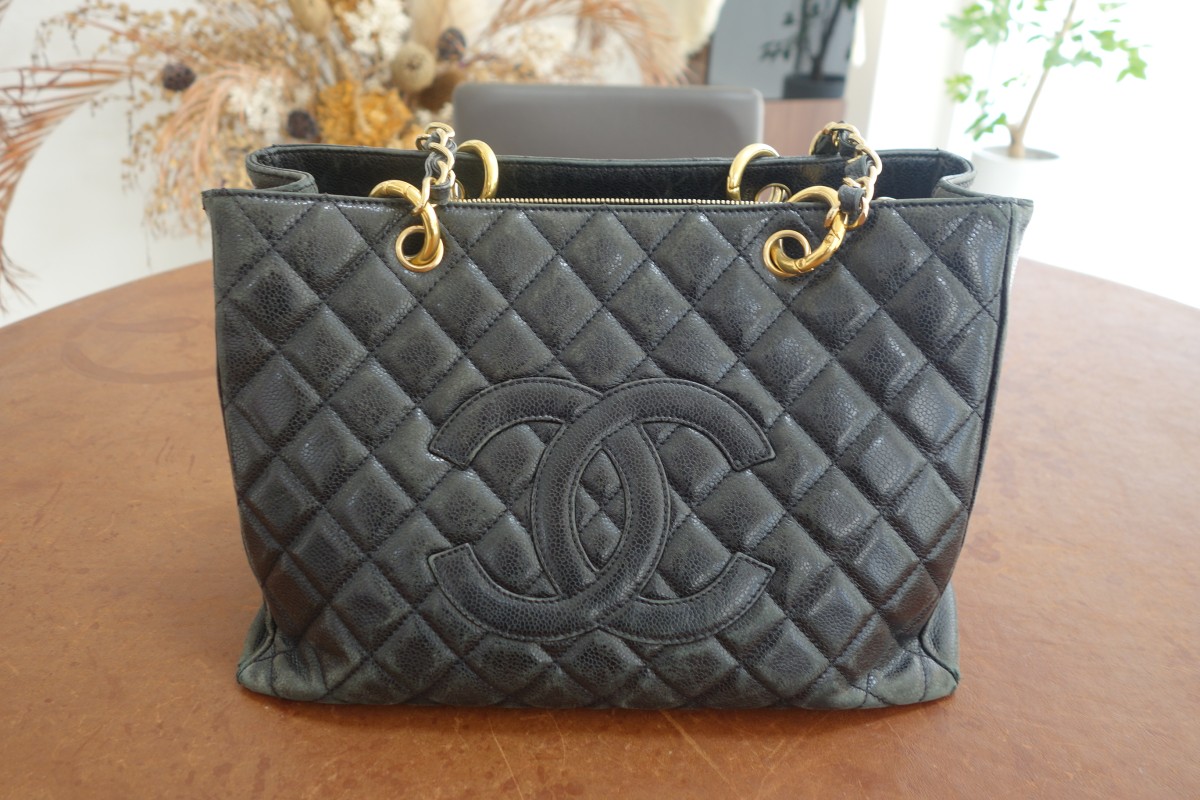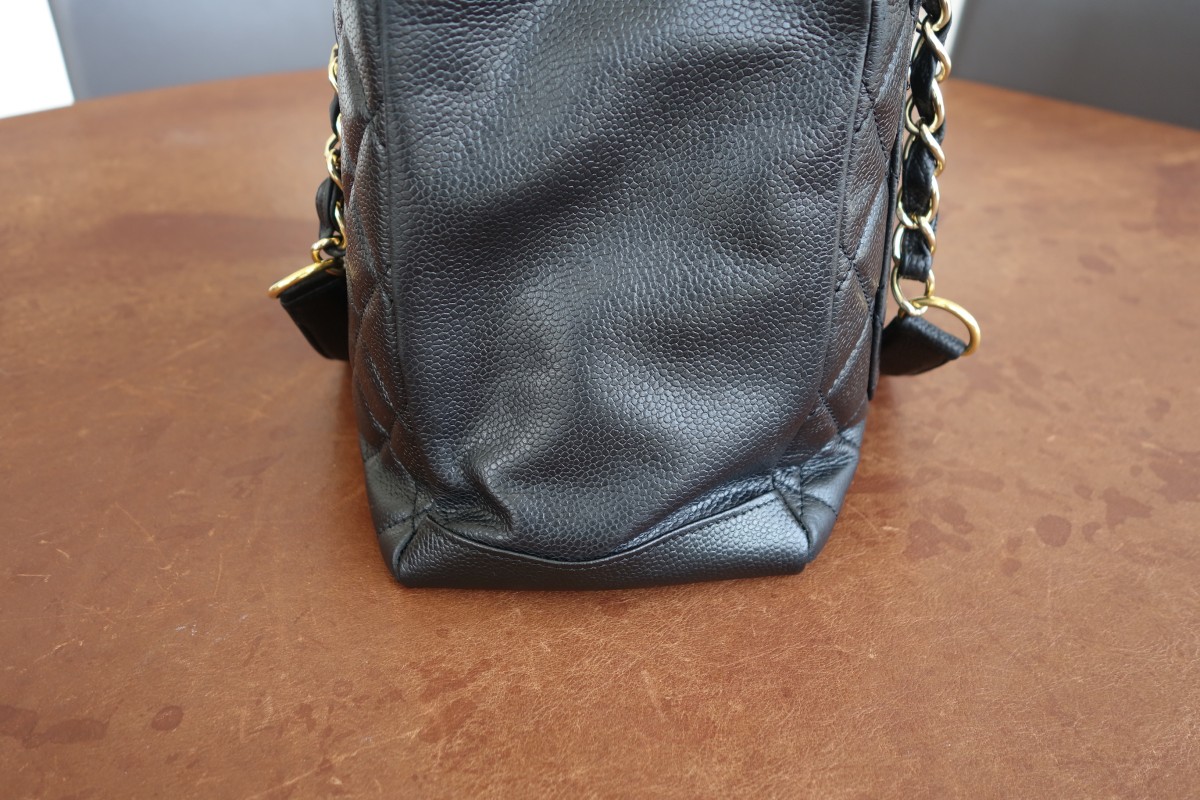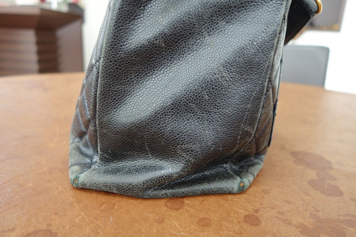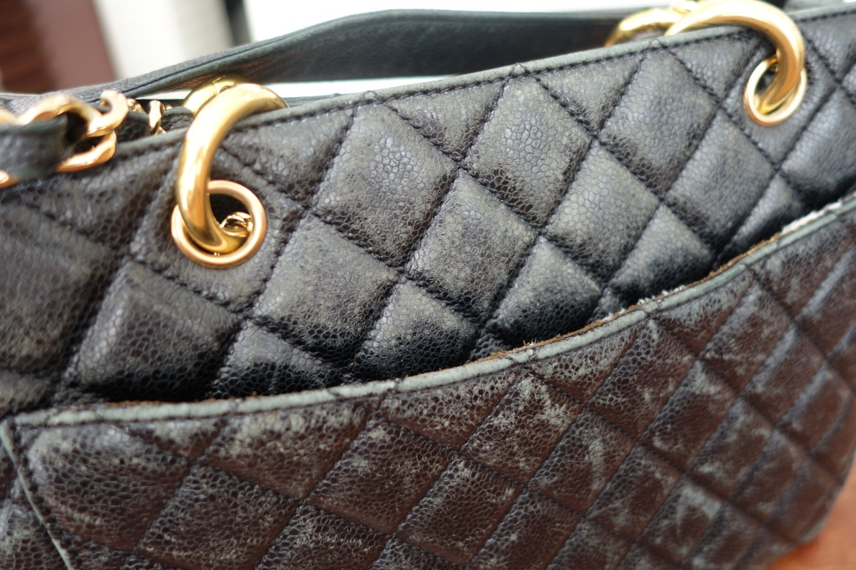 CHANELチェーンバッグです。長年の使用によるフチや角のひび割れや破れには上から革をあて補修しています。