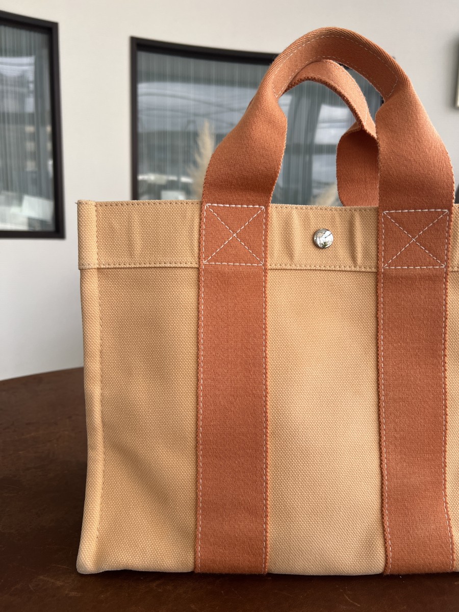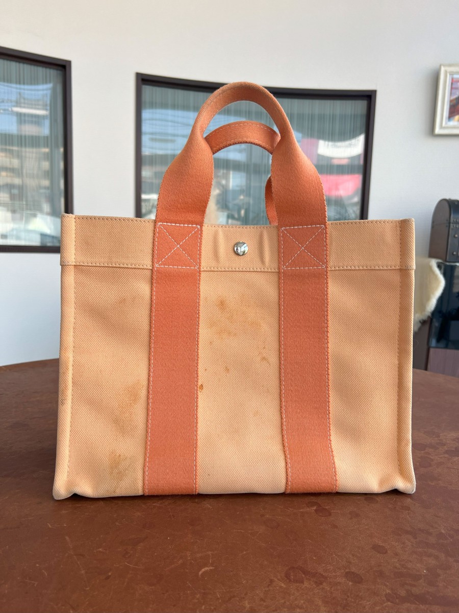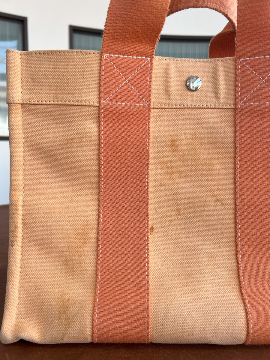 エルメスのガーデンパーティーの日焼け色褪せが酷くエルメスアフターセールスカウンターに持ち込みましたがこんなに状態が悪いとどうにもならないと言われかなり落ち込んでいましたがネットで検索してはなこやさんを知りました。エルメスにも無理と言われてたので少しでも綺麗になればぐらいで期待しすぎないでお願いしました。