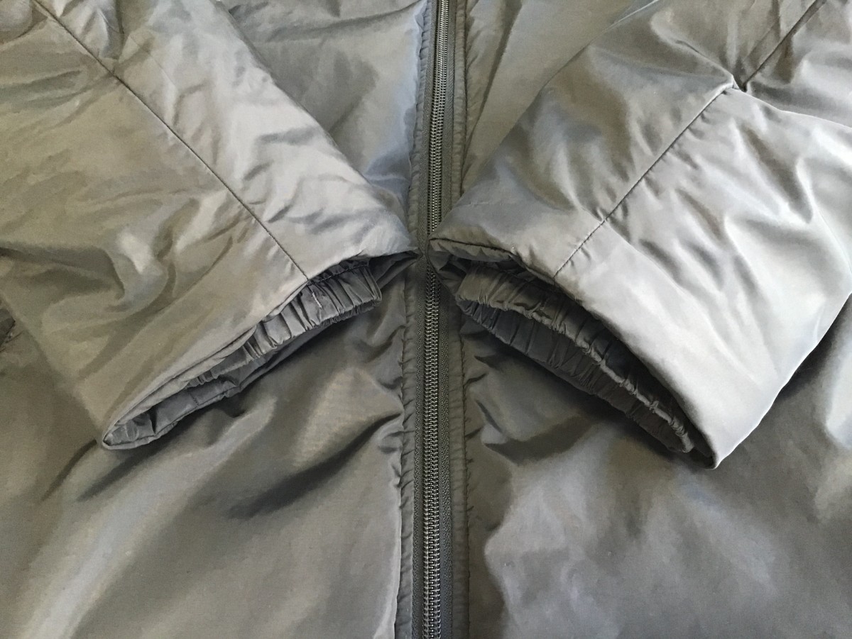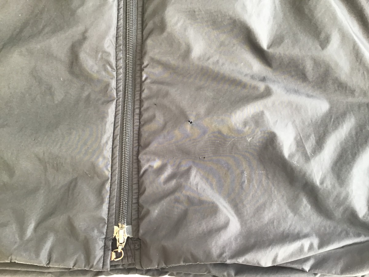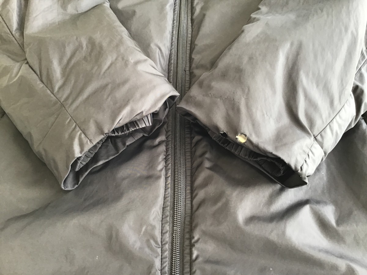 両袖口にある穴は、カットして袖丈を詰める事で補修しました。