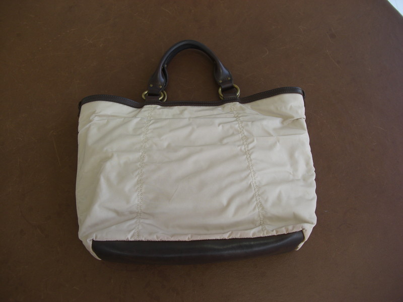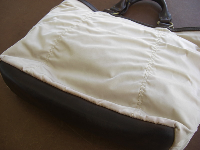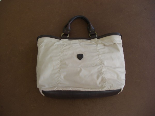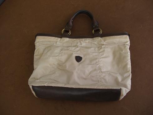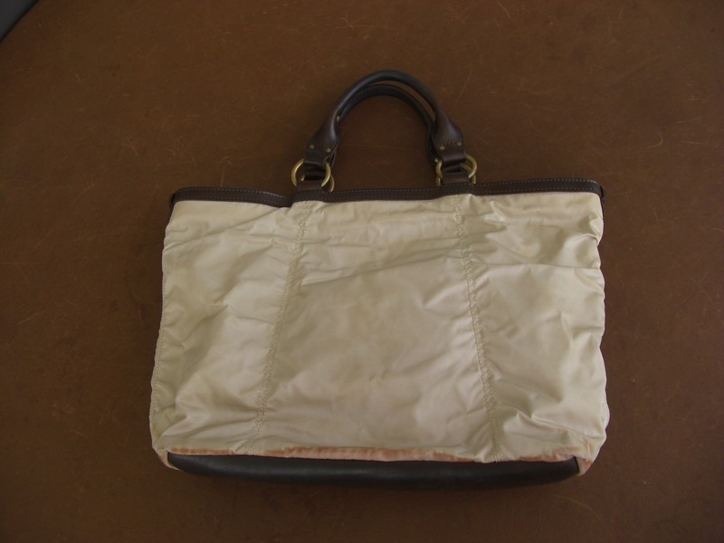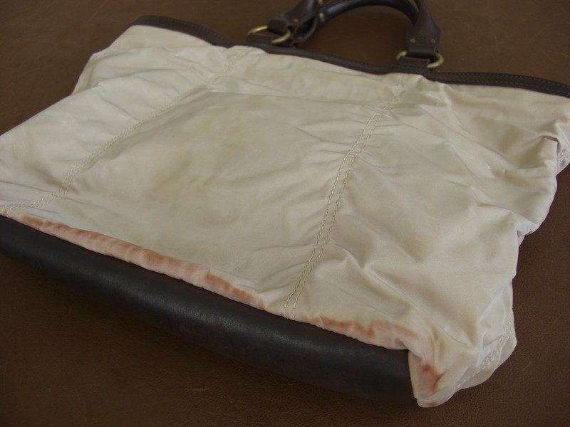 革の部分からナイロン部分に色が滲んだケースです。クレンジングとしみ抜きにてメンテナンスを致します。ナイロンとレザーのコンビのものは洗ったり水に濡れるとレザー部分から色が出ますのでご注意ください。