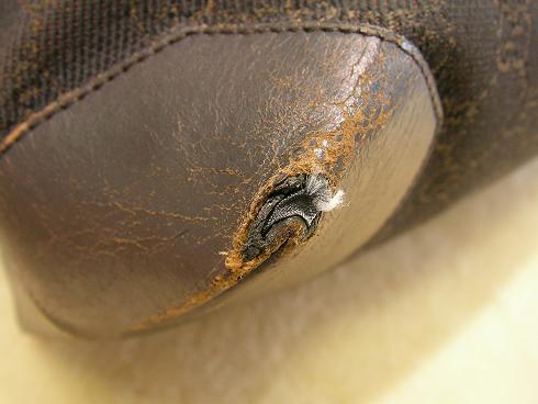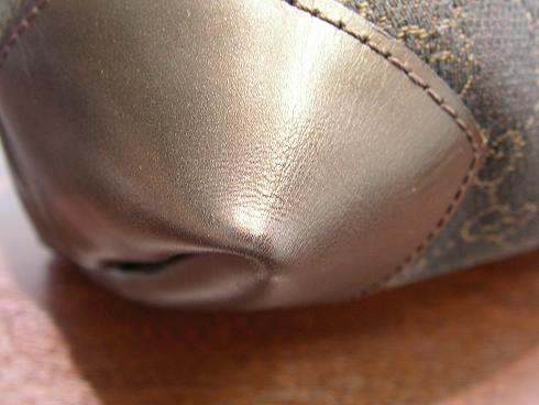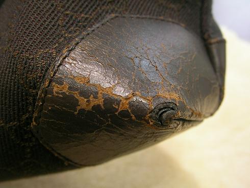 グッチトートバッグです。穴があいた状態やヒビ割れが激しい等劣化が進行した革は完全には復元できませんので、作り替えをお勧めしております。