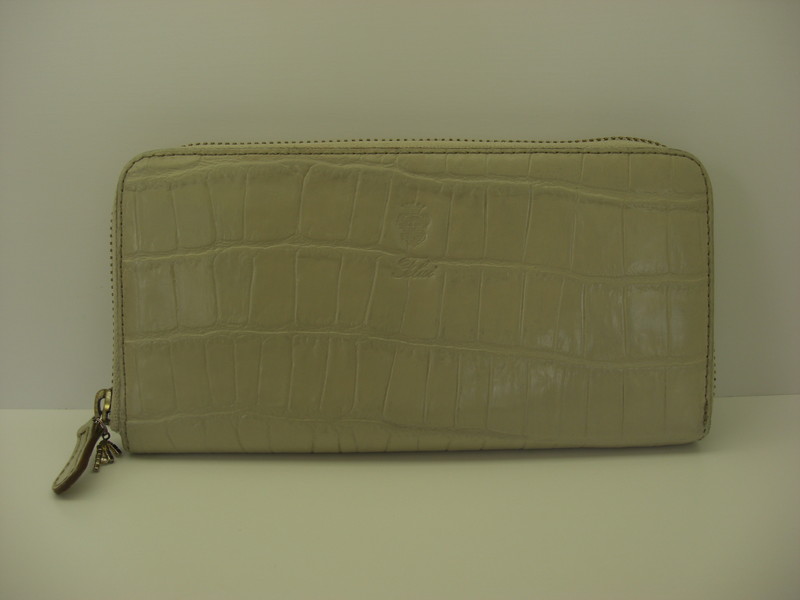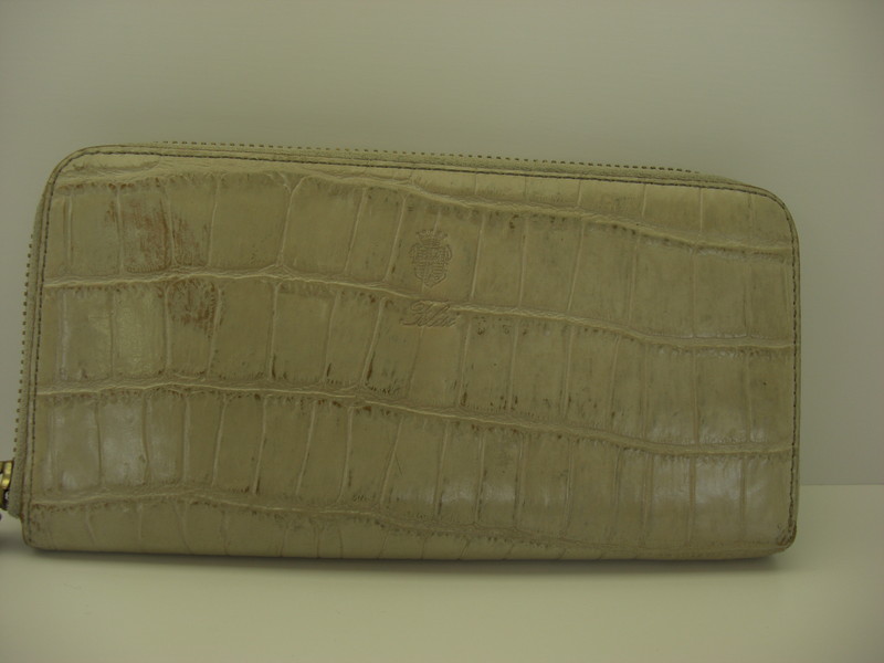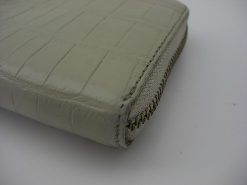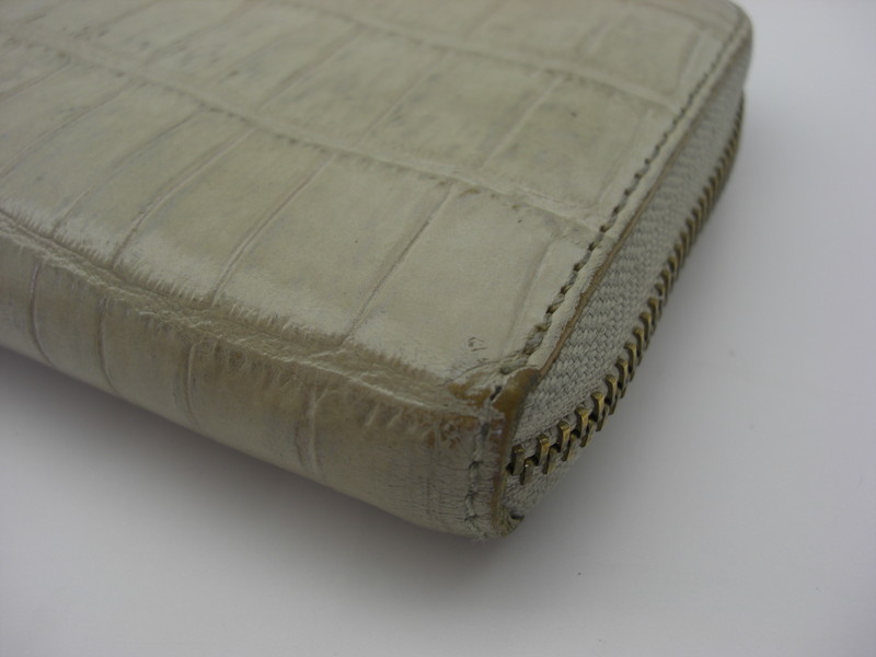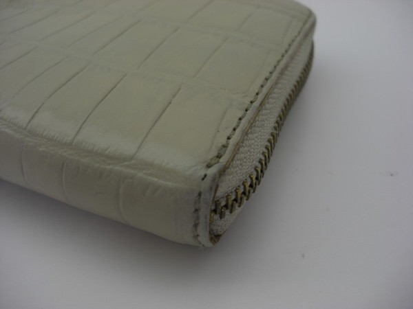 型押しタイプの財布のスレや色褪せは染色補正にて見合えよく致します。状態やお色により黒ずみが透き出たり、質感に変化が出るケースもございます。また水洗いしますのでファスナー部分の手垢も除去可能です。