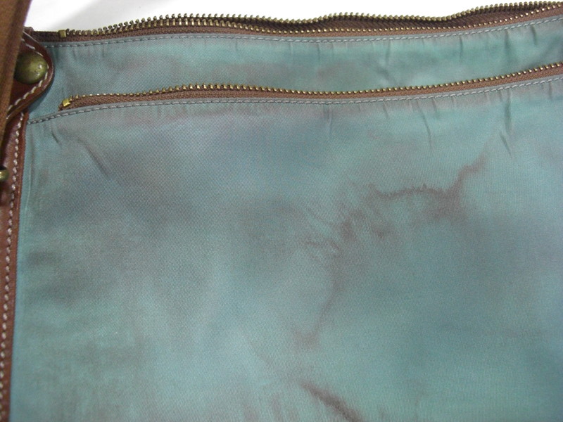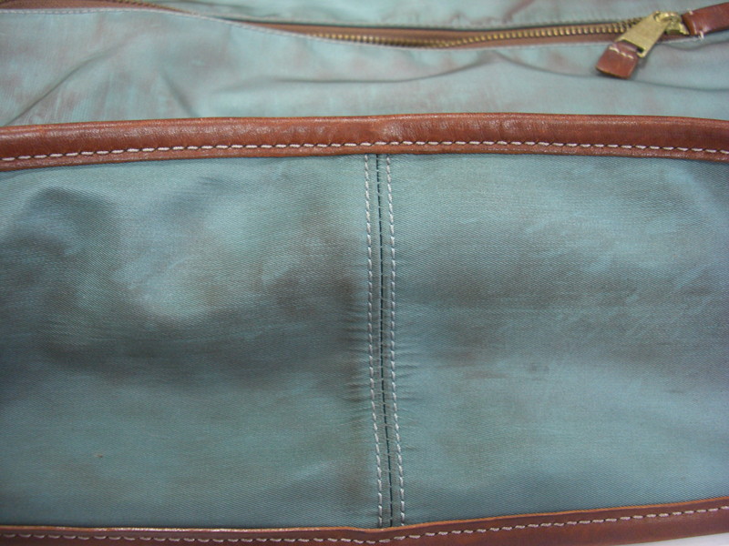 ナイロンバッグの内側が綿素材の場合は裏地から色移りするケースもあります。新しいしみは除去可能ですが古いものは取りきれません。このような状態の物はお早めにご相談ください。