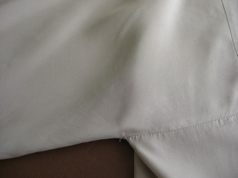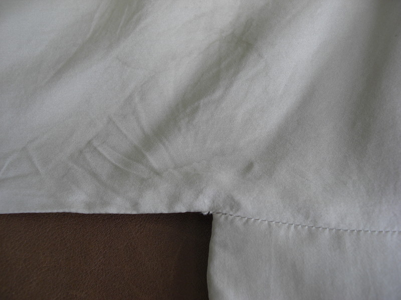 シルク素材は水が付いただけでもシミになりやすいです。今回は香水のシミなどは事前に染み抜きして、汗ジミはウエットクリーニングで除去しました。このようなシミはドライクリーニングでは除去出来ませんので水洗いクリーニングのできるお店にご相談されることをお勧めい致します。
