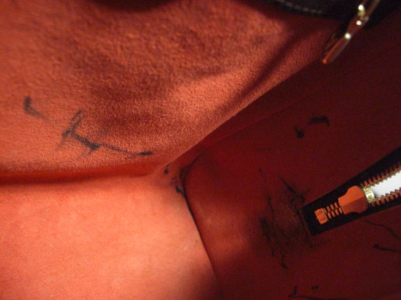 内袋についたボールペンのジミは内袋の素材により除去可能です。ボールペンも種類により取れないものもございますのでどうぞお気軽にご相談ください。