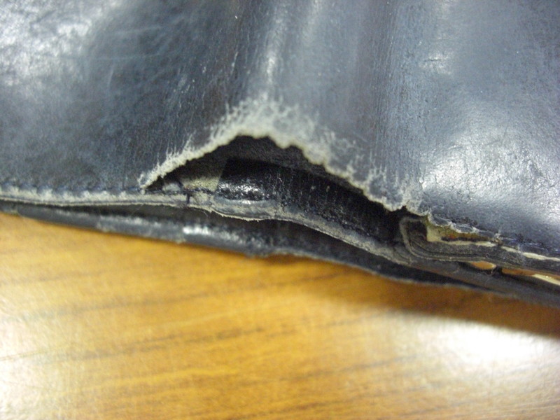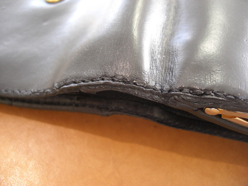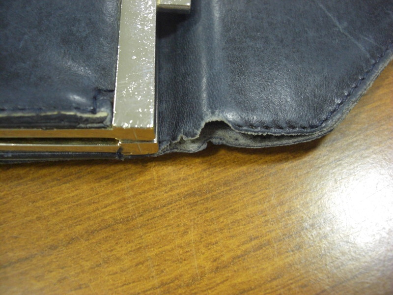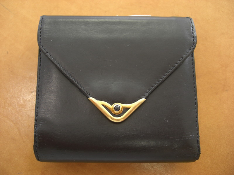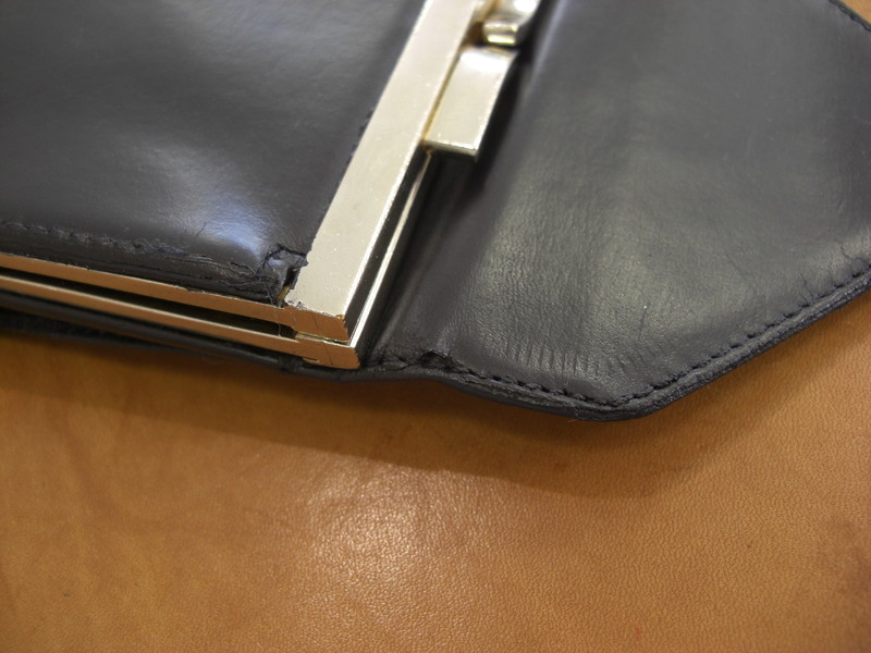 カルティエ財布です。使用による経年劣化がみられます。ステッチ切れや破れは縫いこんでお修理いたします。スレ・キズは染色補正にて復元いたします。