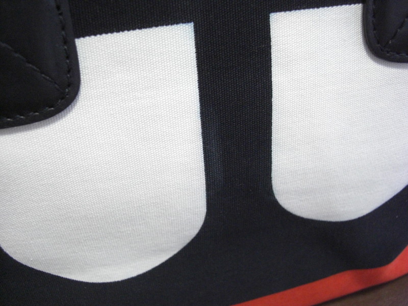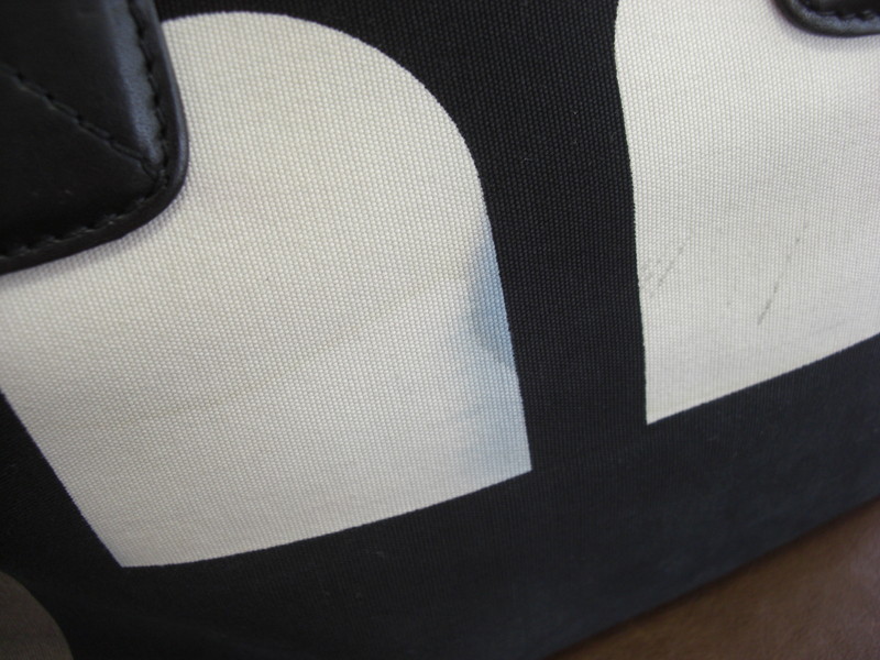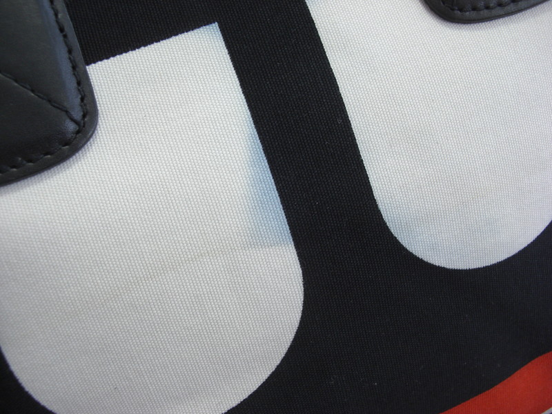 BALLYのキャンバスバッグはキャンバス部分にプリントが施されているタイプで、水に濡れたりすると白い部分に黒い色が移ってしまいます。部分的に漂白加工を施して色移りを除去します。時間が経過しているものや範囲が広いものは完全に取れないケースもございます。