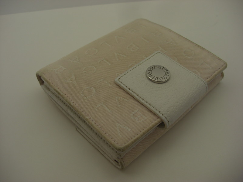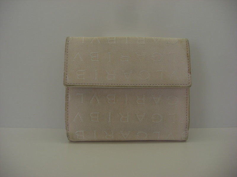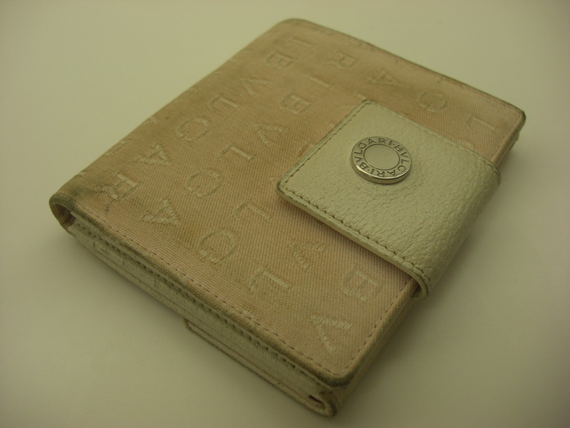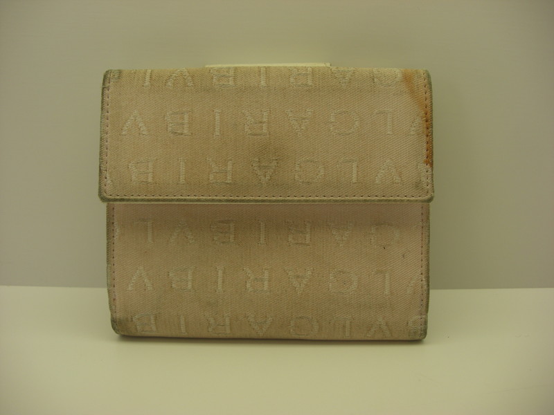 ブルガリキャンバス素材財布の使用による手垢などの汚れは全体をクレンジング(洗浄)にて除去致します。黄ばみなどは多少薄く残りますが、概ね綺麗になります。