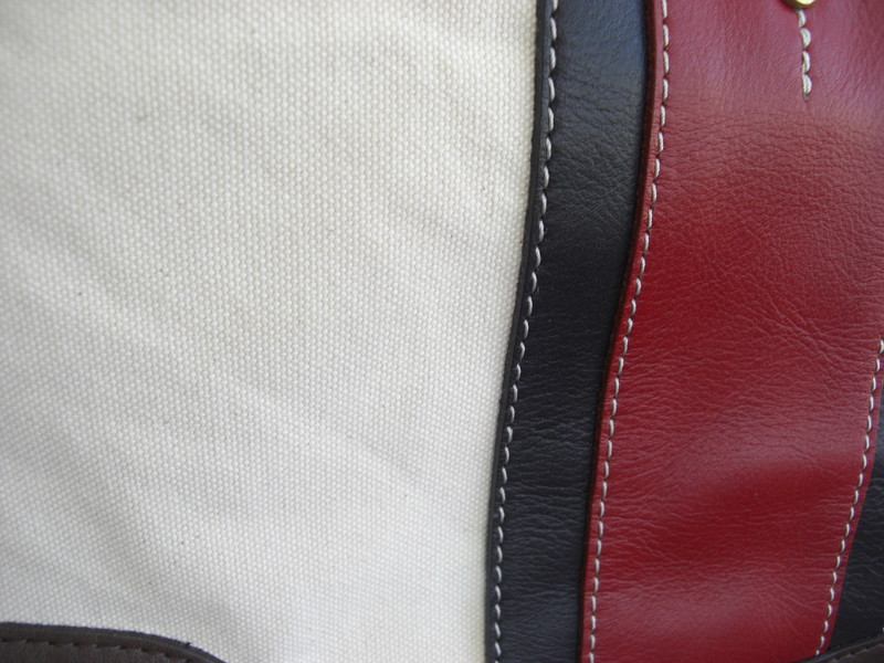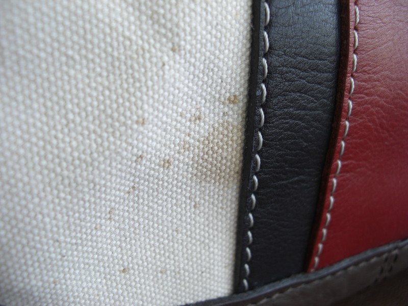 キャンバス生地に醤油などの食べこぼしのようなシミがついております。この場合水で洗浄しても綺麗になりませんので、部分的に漂白加工を施してシミを綺麗にします。キャンバス素材にはシミや今後の汚れ予防としてハイパー撥水コーティングがお勧めです。