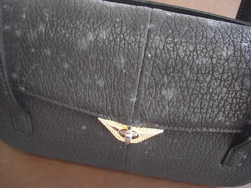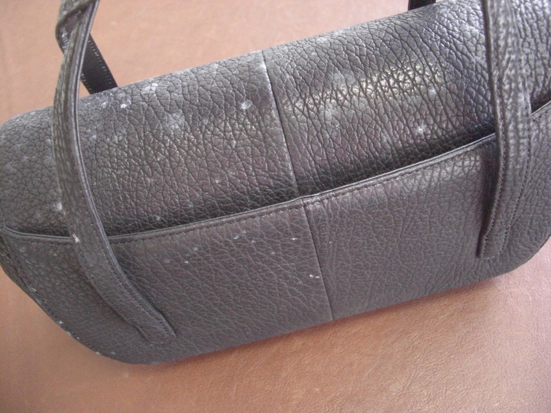 シャークスキン素材のバッグにカビが生えた場合はクレンジング(水洗い)を施してカビを除去いたします。カビによる変色部分は染色補正を施して目立たなくしています。
