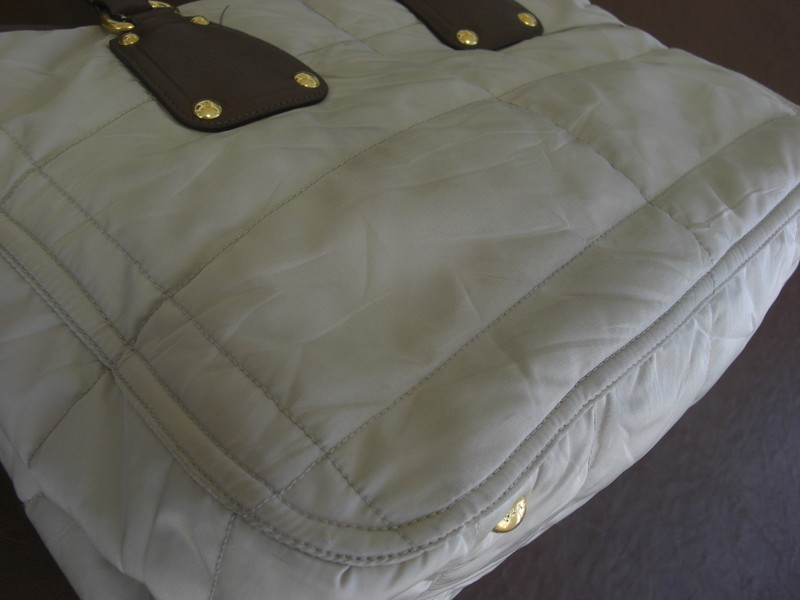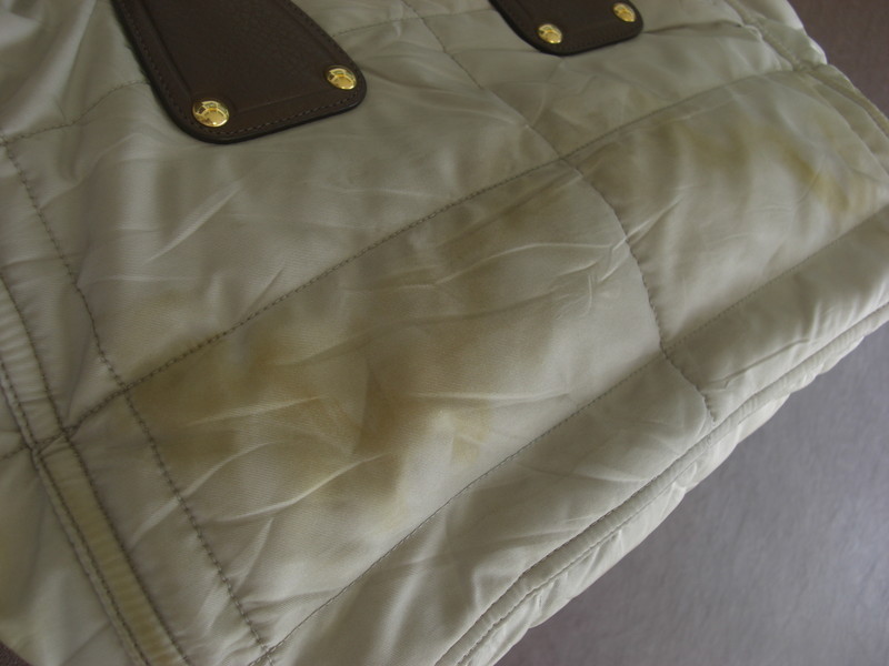 レザーから色が出てナイロン地に色が移ってます。この場合は漬け置き洗いでしっかりと汚れと色を落とすことで綺麗な状態にもどります。色移りは時間が経過していないものであれば比較的簡単に除去可能です。