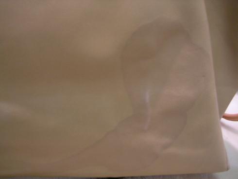 ペットボトルの飲み物が中からこぼれて表面に染みができたケースです。表のシミは染色補正にて目立たなく致します。内側は染色することが出来ませんのでクレンジング(水洗い)で出来る限り除去致します。薄く残るケースがございます。