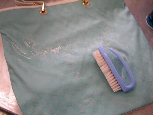 キャンバス部分は水で洗浄することで、全体のくすみや黒ずみが取れて鮮やかな色合いに戻ります。部分的な黄ばみは漂白にて綺麗にします。洗い上がったレザー部分は染色補正を施して傷や色あせを改善します。