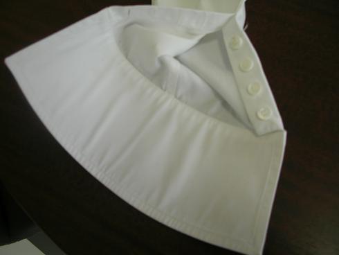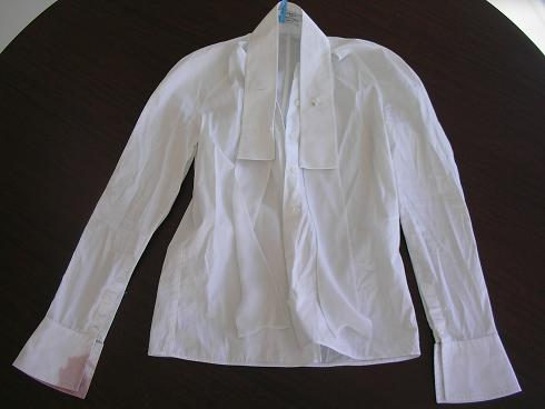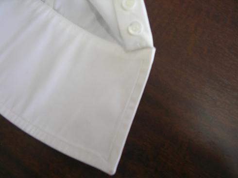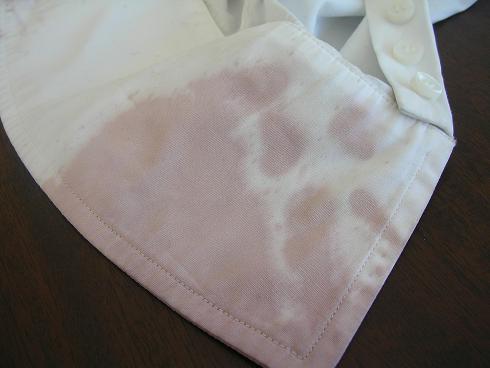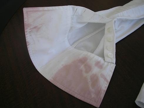 ブラウスに赤ワインのシミがついた事例です。赤ワインが生地に浸透して赤いワインの色素が残っています。この状態になると水洗いだけでは取れないシミとなります。この場合は水洗い後にホワイトニング(漂白加工)を施してシミや色素を除去します。