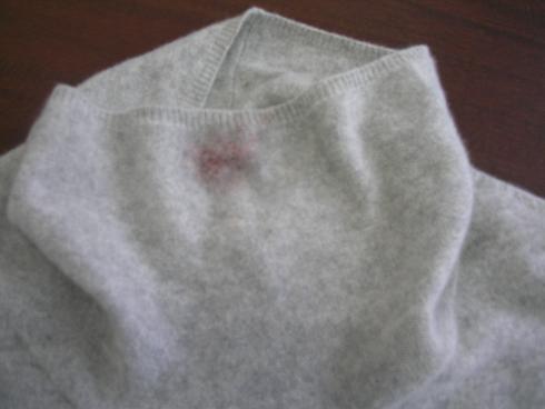 カシミアワンピースに赤ワインのシミが付いた事例です。今回のシミは繊維に浸透していない状態でしたので一手間を加えたウエットクリーニング(水洗い)で除去します。繊維に浸透して時間が経過したものであればウエットクリーニングだけでは取れませんので、このような状態のものは早めの処置をお勧めいたします。