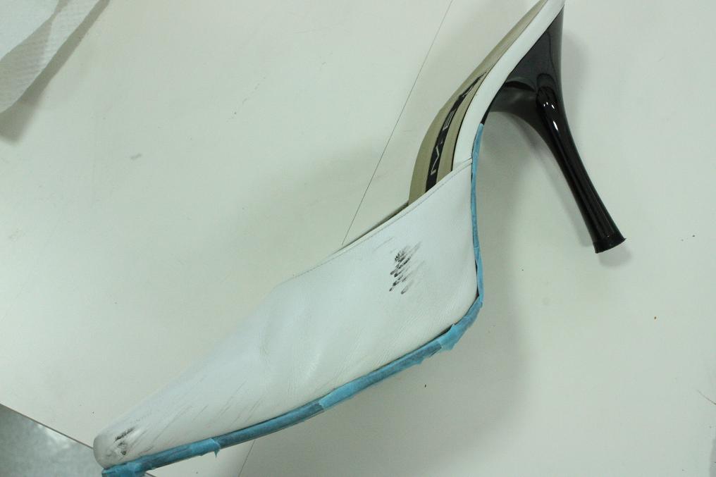 白い靴のつま先やサイドのヒールやソールのラバー汚れは比較的簡単に落ちる汚れです。今回は全体的にくすんでいたので染色補正をし明るくしております。