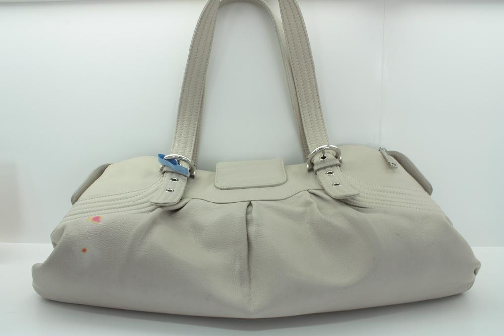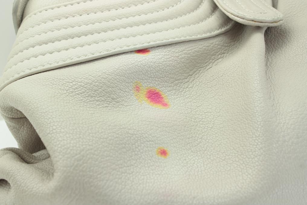 フェラガモのレザーバッグのインク染み補正のご紹介です。クレンジングと染み抜きでインクを除去した後は、表面を染色補正して本来の状態に戻します。