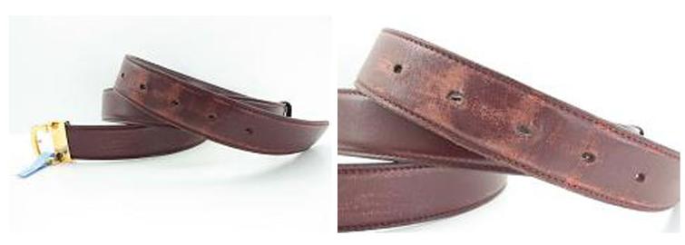 革ベルトの擦れや傷は染色補正にて見栄えを良く致します。全体的に革の状態が悪い場合は同じようにベルトを作成する事も可能です。ベルト修理で良くあるサイズ調整の穴あけもその場でさせて頂きます。