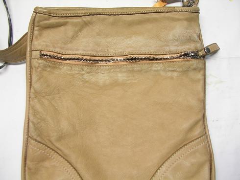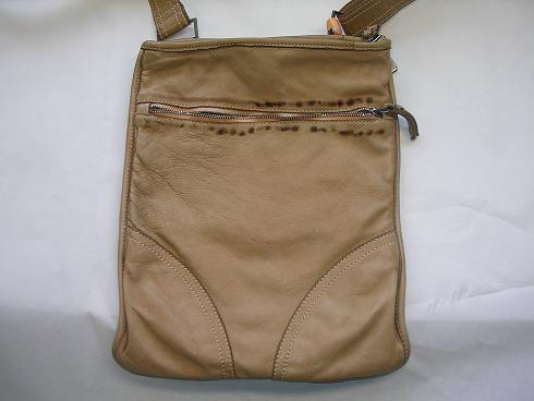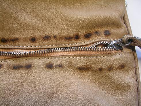 レザーバッグの接着剤の染み出しは染み抜き後に染色補正を施すことで改善致します。