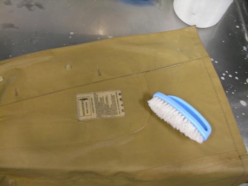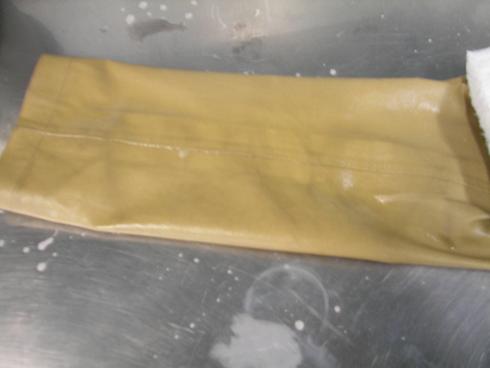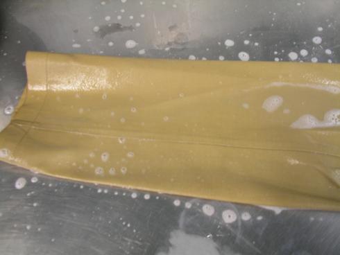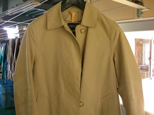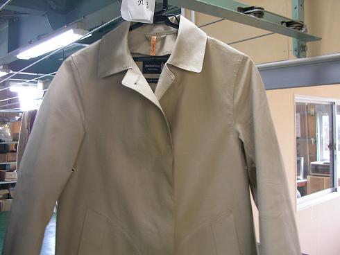 マッキントッシュの雨染みはウェットクリーニング(水洗い)で除去していきます。接着剤の染み出しは除去不可となります。