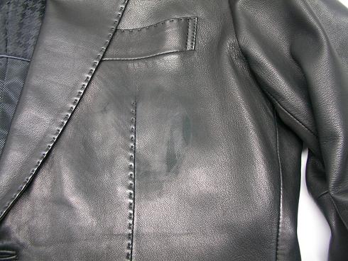 レザージャケットについたシール跡は全体クレンジング(水洗い)後染色補正を施します。今回は全体的に汚れは少なかったので今回は胸のシミ抜きと色補正で修復しております。