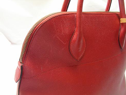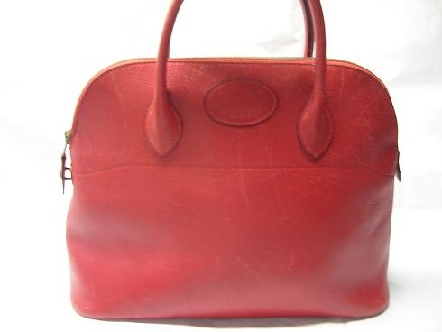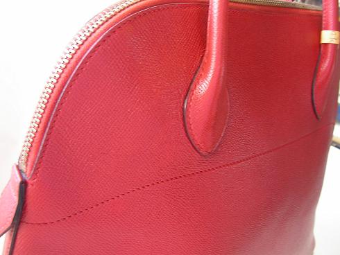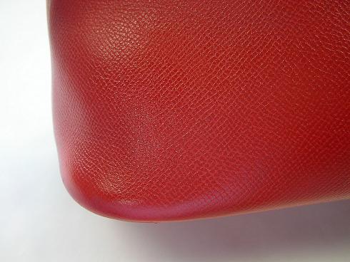ボリードの四隅の擦れによる傷や色落ちは染色補正にて修復いたします。トリヨンクレマンスの柔らかな質感を変えることなく、エルメス独特の透明感のある風合いを意識してのケアとなります。
