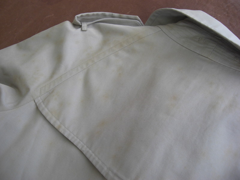 トレンチコートでは良くご相談いただくケースですが、これは保管中に起こったカビによる変色です。このようなシミはドライクリーニングではもちろん、水洗いしても落ちないものです。Hanakoyaでは全体を漬け込んで漂白加工することで黄ばみやカビを除去します。仕上げには撥水コーティングを施しますので多少の雨や食べこぼしなどは弾きますので、シミ予防になります。