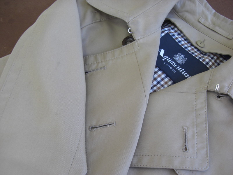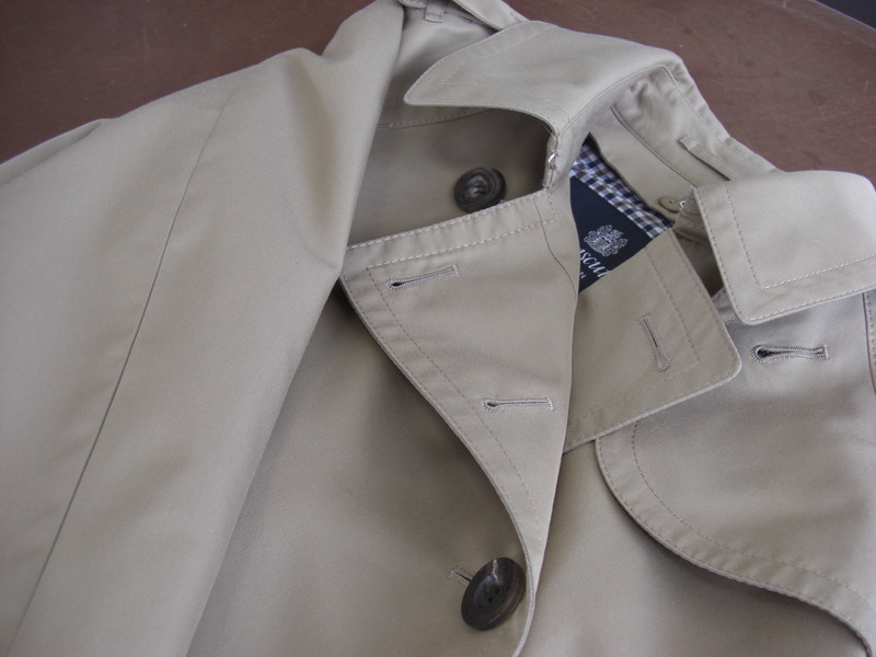 アクアスキュータムトレンチコートシミ除去のご紹介です。バーバリー同様にアクアスキュータムのトレンチもメンテナンス依頼が多いアイテムです。もちろん撥水コーティングも施します。