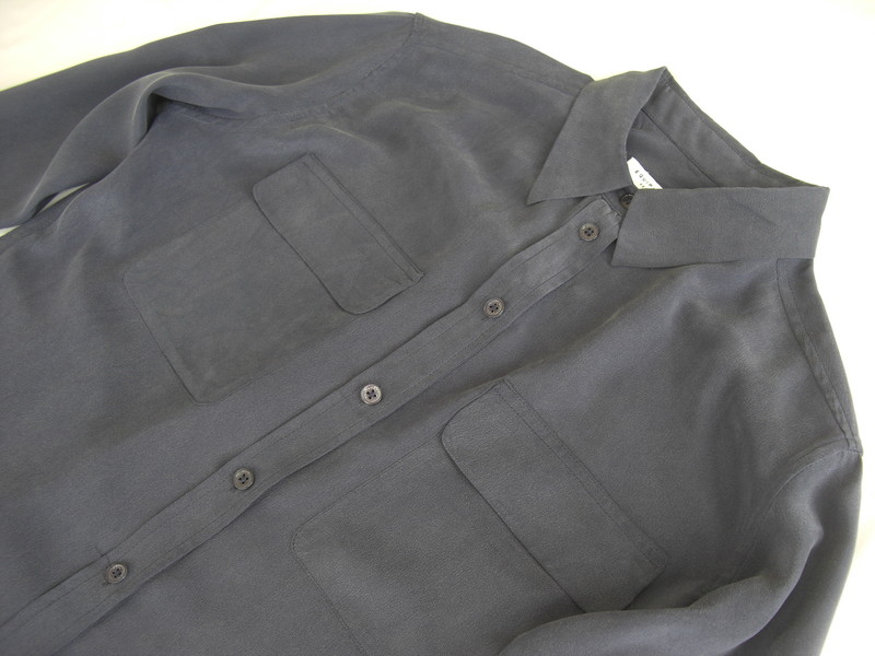 EQUIPMENTのウォッシャブル加工のシルク素材なので自宅でも洗えそうですが、シルク素材なので水洗いではシワや縮みが起こります。シワや縮み以外にも光沢感が無くなったり、シワの部分が毛羽立って色落ちなども起こりますのでご注意ください。この場合はトリートメントに漬け込んで縮みやシワを解消します。多少の色落ちであれば発色するので改善しますが、色落ちが酷くて気になる場合は染め直しや染め替えなどもご提案させていただきます。