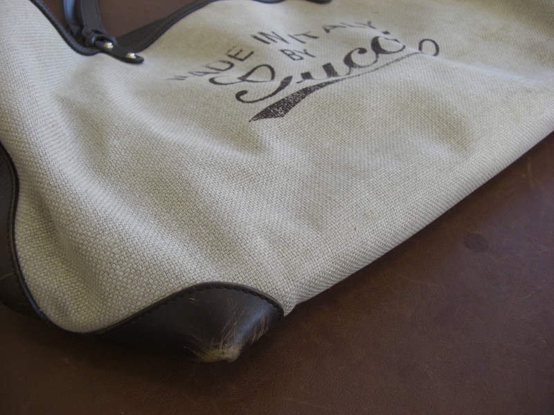 このようなレザーとコンビのバッグはクレンジングするとレザーから色が出ますので、色が出ないように弱い洗浄液で優しく洗います。そのため、黄ばみや黒ずみは完全には落ちないケースもございます。レザー部分の擦れやキズは染色補正することで概ね改善いたします。
