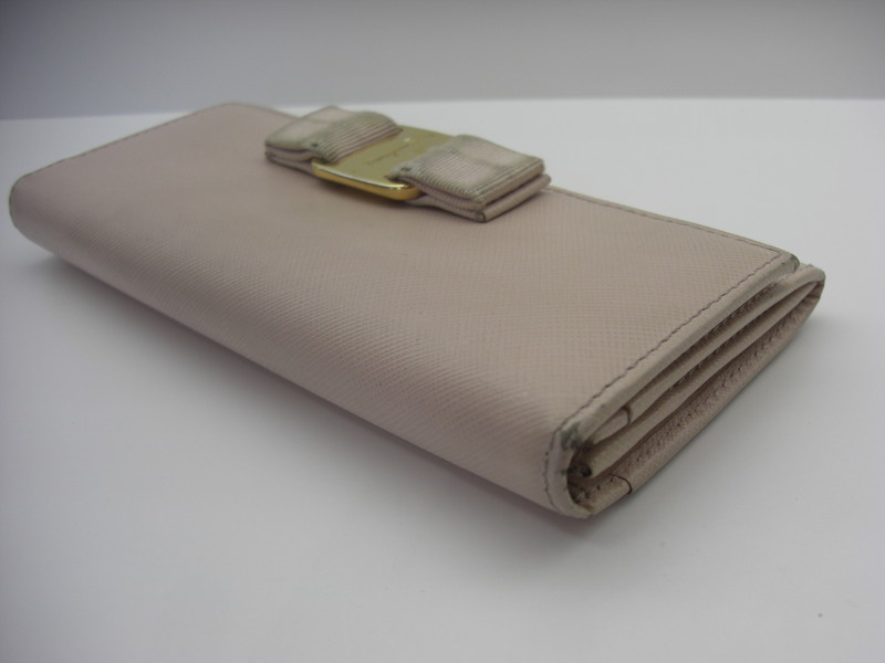 フェラガモのリボン付財布のメンテナンス紹介です。全体をクレンジングしてリボンやレザー部分の黒ずみを落とし、リボンの破れた個所は同色の糸を差し込んで穴を塞ぎます。